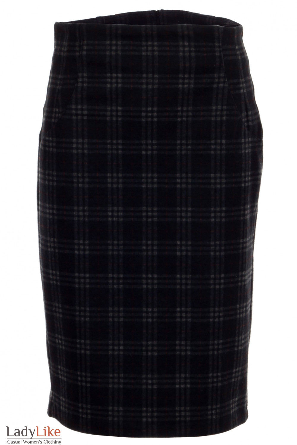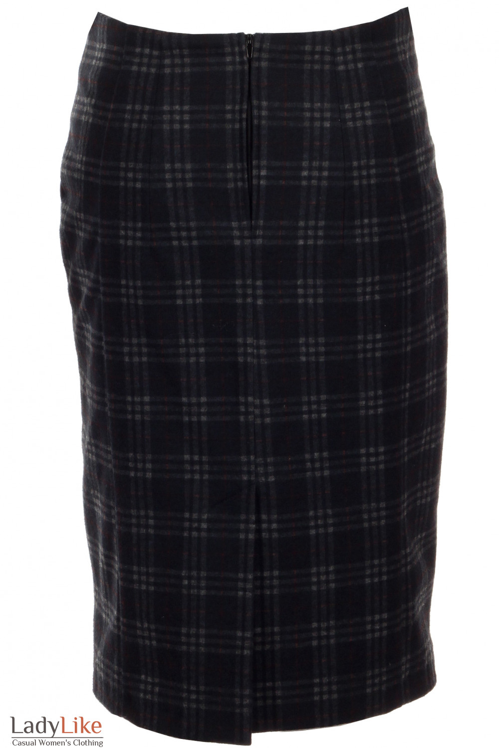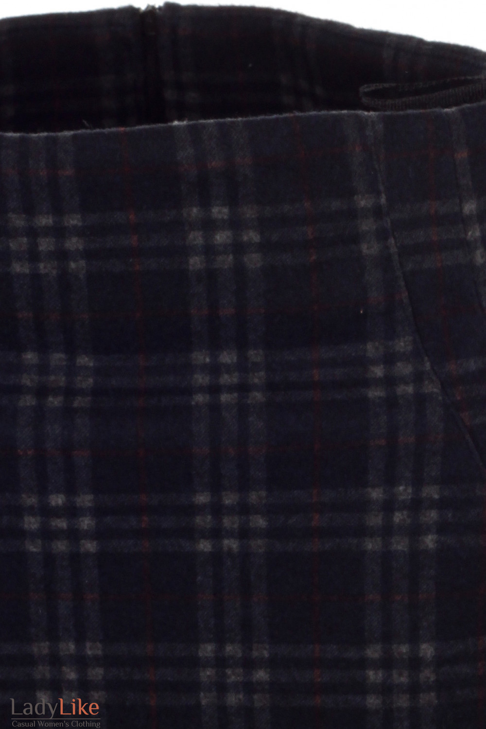 Спідниця з завищеною талією тепла синя в клітинку. Декоративні рельєфи по боках. Застібка ззаду на блискавку. Спідниця без поясу зі шлицею. На трикотажній підкладці.