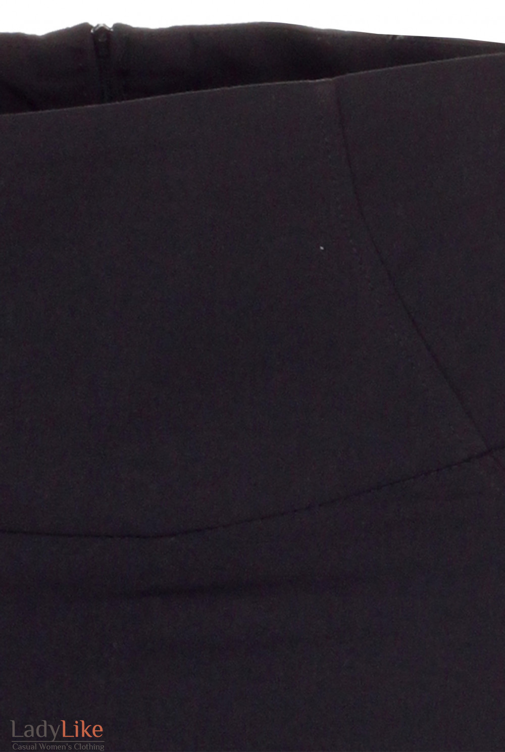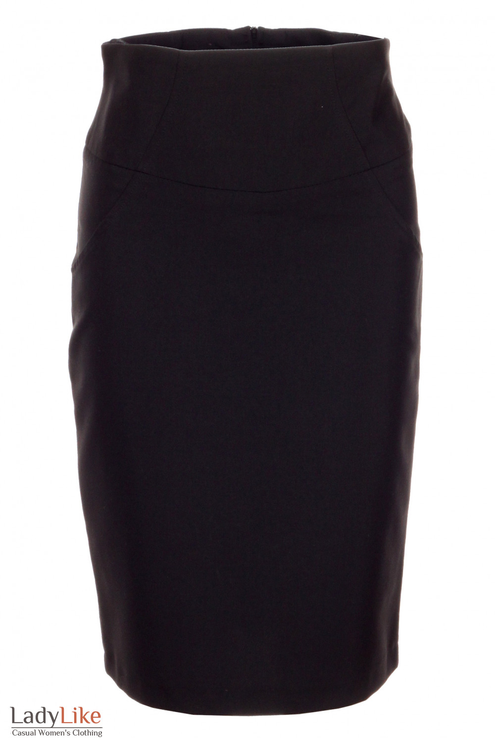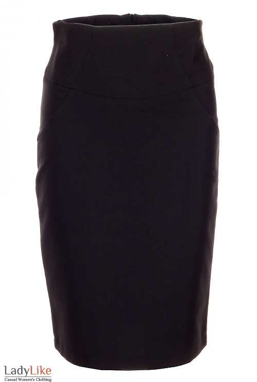 Чорна спідниця з високою талією. Пояс прикрашений косими рельєфами, ззаду невелика шлиця. Застібка на блискавку ззаду. На трикотажній підкладці. Довжина близько 60 см.