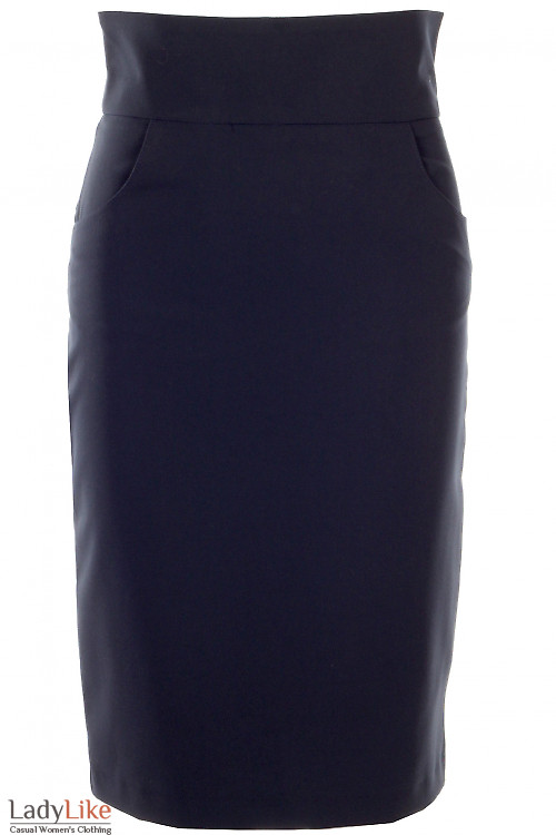 Спідниця темно-синя з високою талією. Під широким поясом бокові кишені. Застібка ззаду на блискавку і три гудзики. На трикотажній підкладці. Довжина близько 60 см.