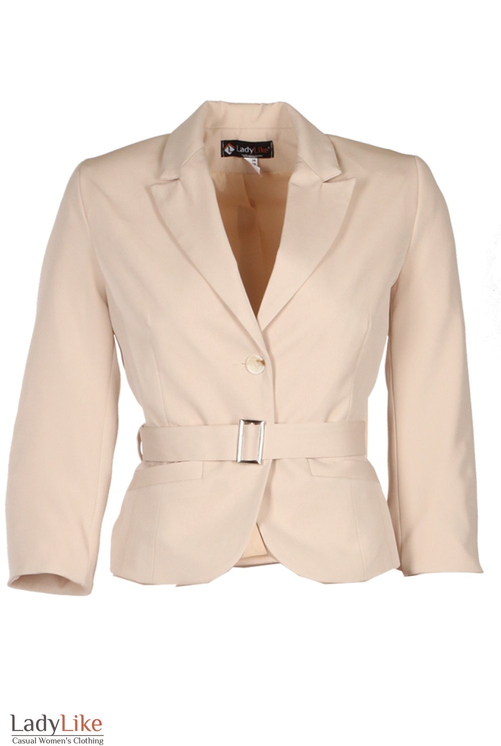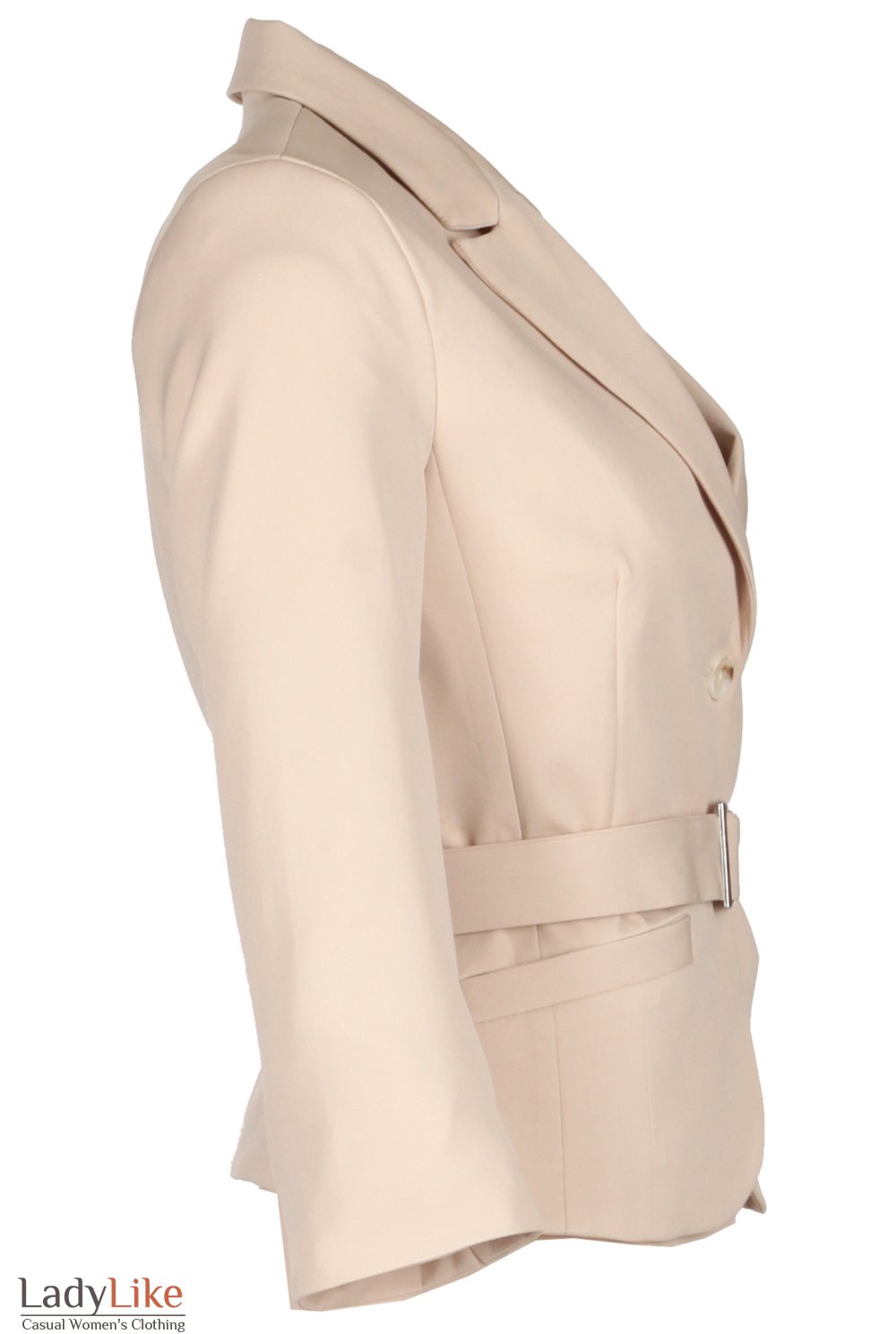 Жакет приталеного силуету. Англійський комір. Рукав довжиною в три чверті з відворотною манжетою. Жакет з декоративним поясом з пряжкою. На підкладці. Довжина близько 51 см.