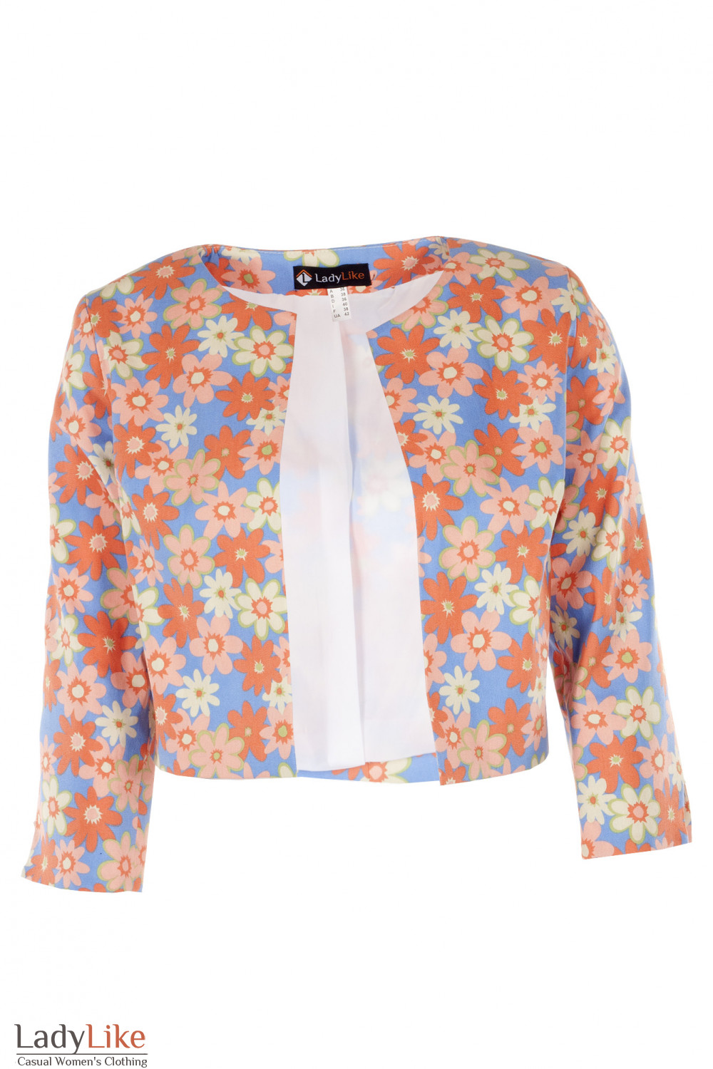 Короткий джинсовий жакет-болеро. Без застібки. Прямий крій. Рукав довжиною три чверті з розрізом. На підкладці. Довжина близько 40 см.