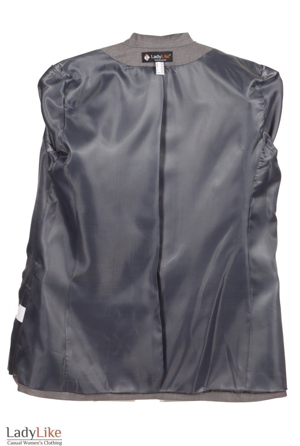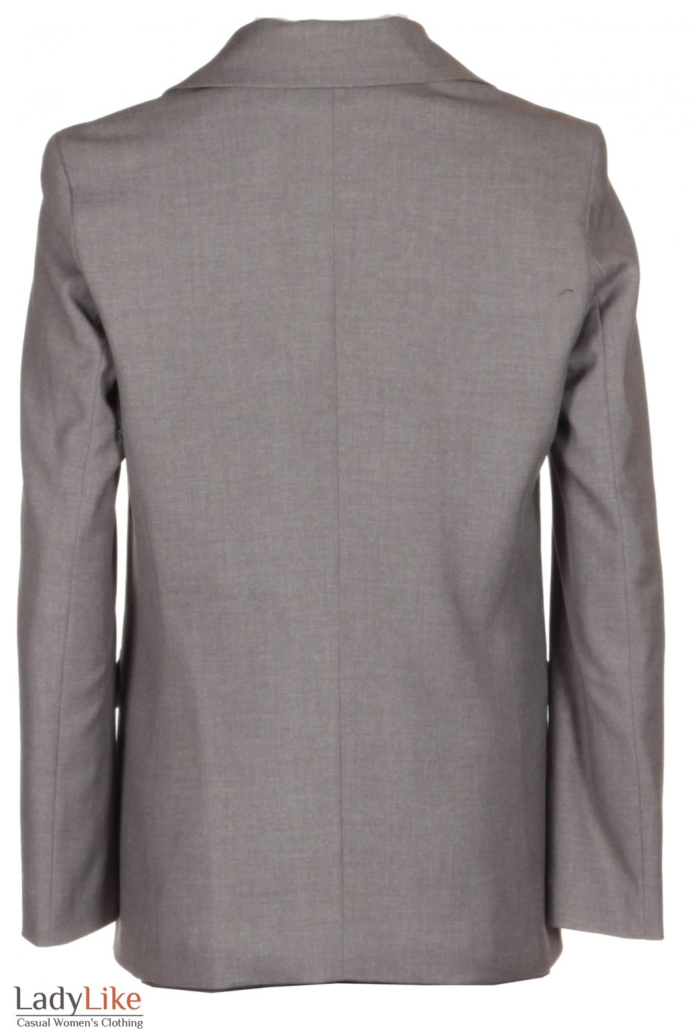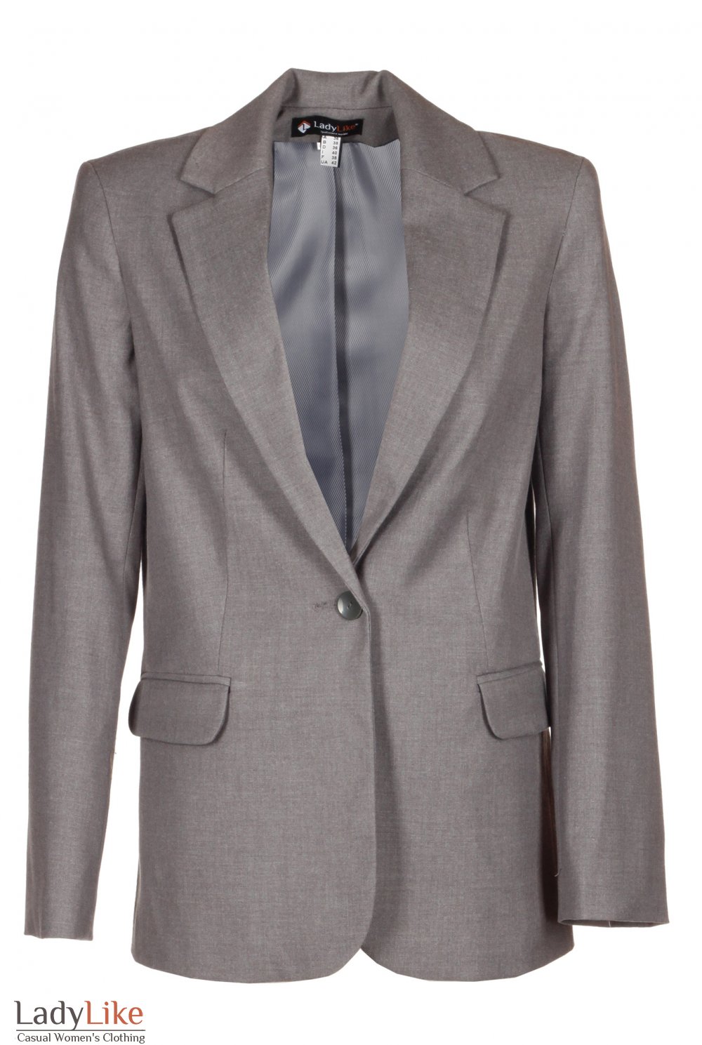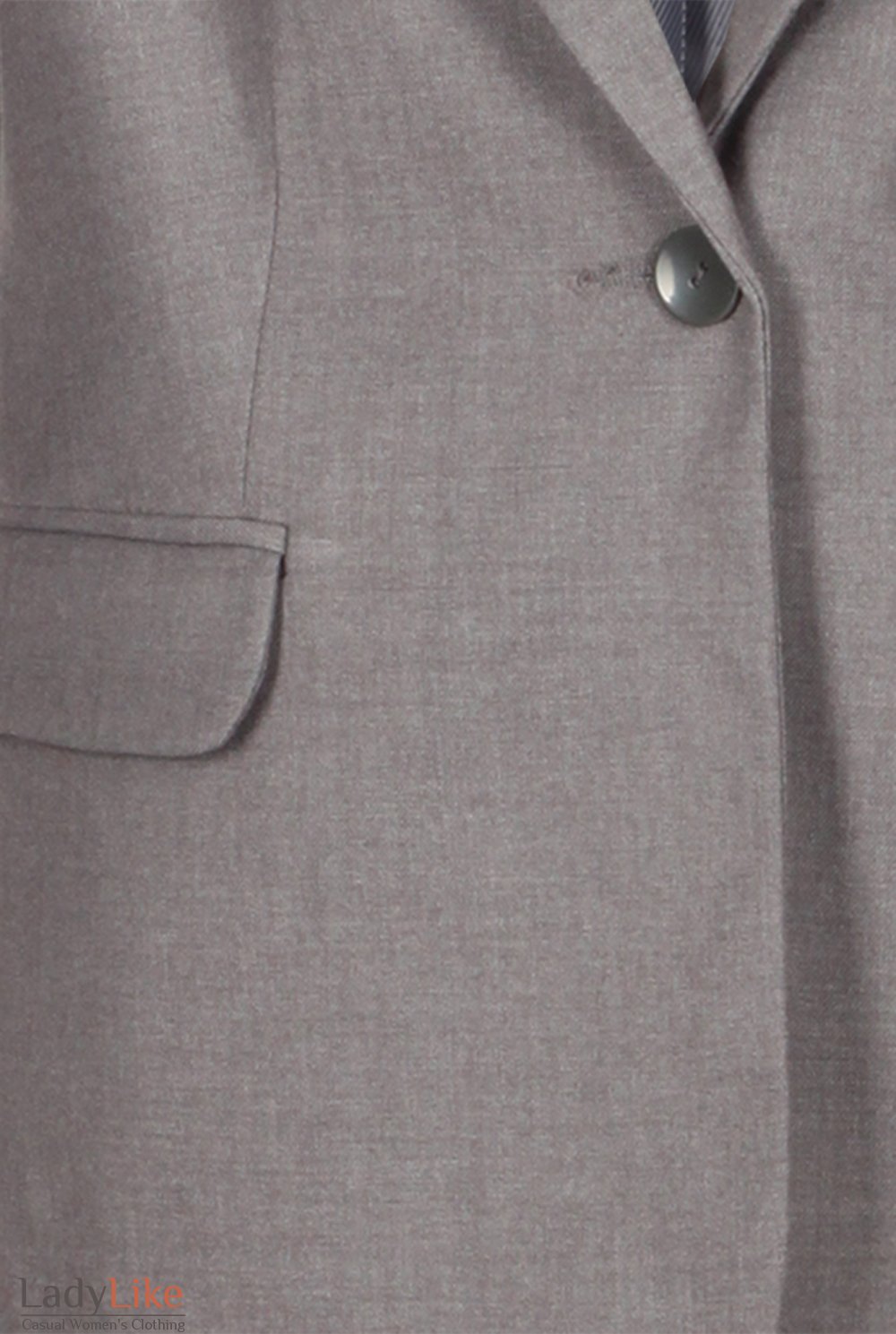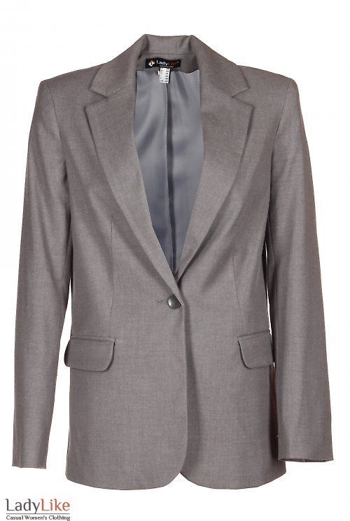 Жакет подовжений приталений світло-сірий. Однобортний, застібка на один гудзик. Англійський відкладний комір з лацканами. Попереду кишені із клапанами. На підкладці. Довжина жакету 70 см.