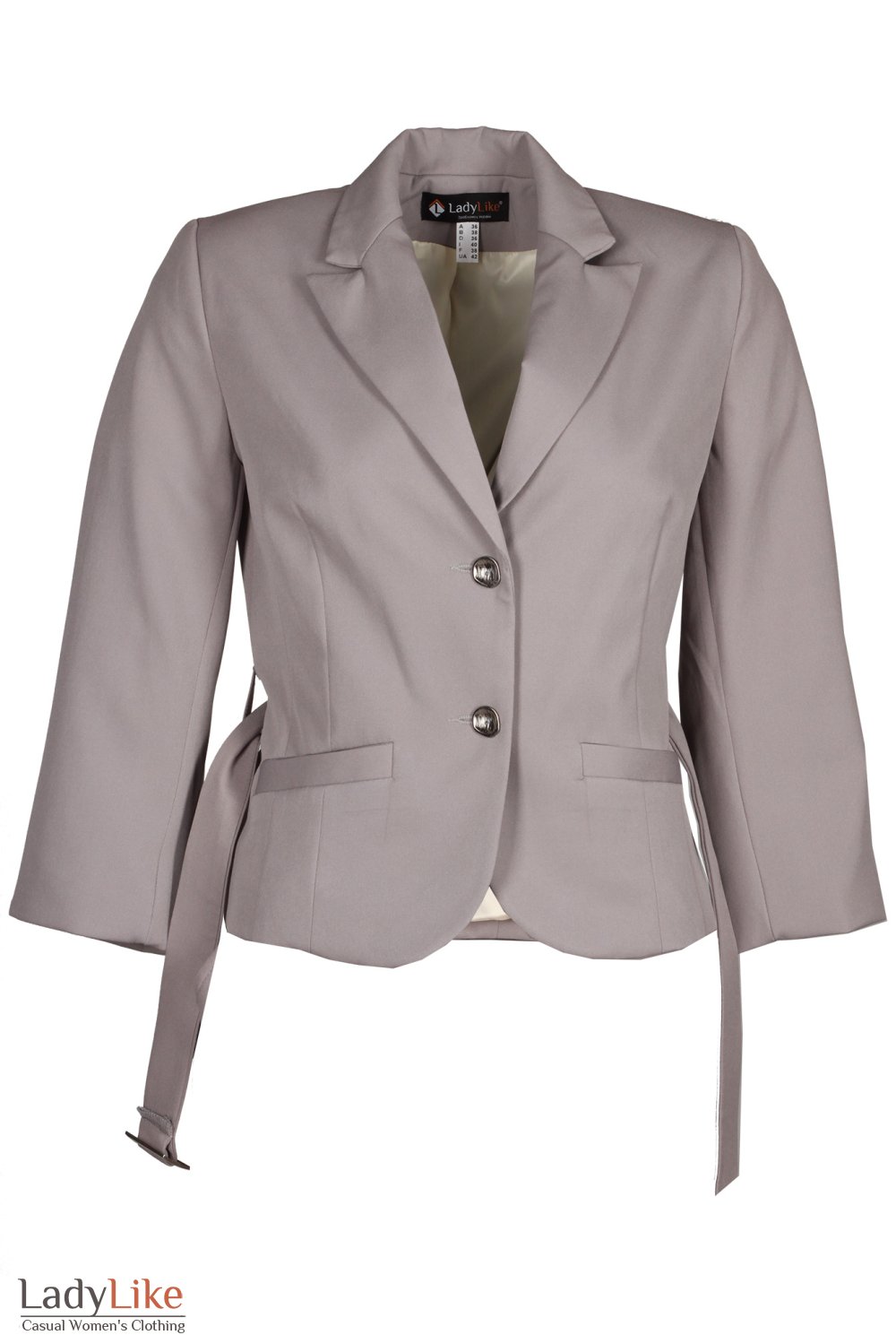 Жакет приталеного силуету. Англійський комір. Рукав довжиною в три чверті з відворотною манжетою. Жакет з декоративним поясом з пряжкою. На підкладці. Довжина близько 51 см.