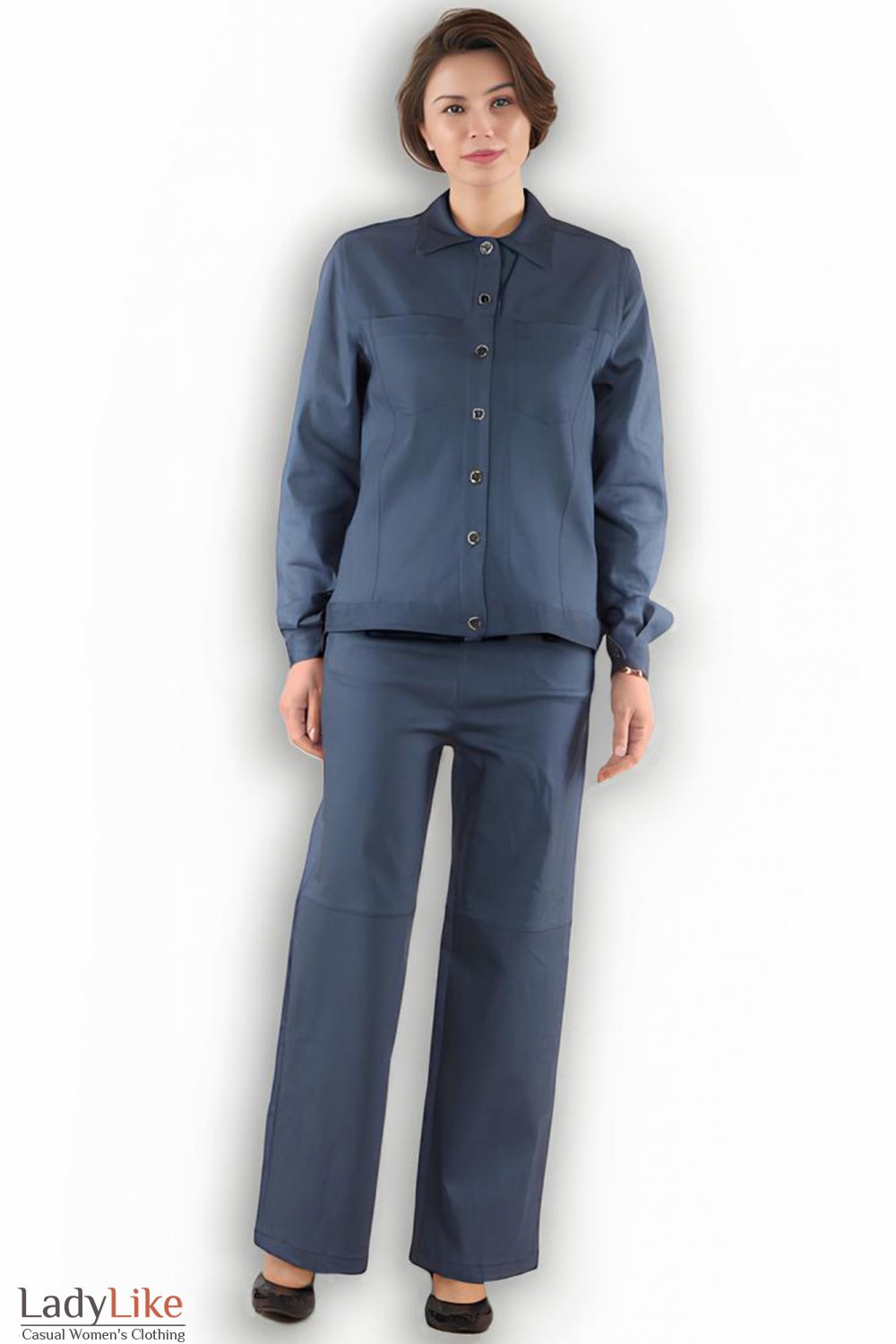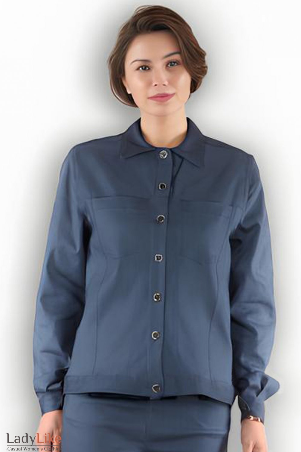 Жіночий джинсовий жакет синього кольору. Прямий, злегка подовжений, горловина оформлена відкладним коміром, на грудях дві функціональні накладні кишені, попереду жакет застібається на гудзики. Рукави довгі з манжетами на один гудзик. Попереду та ззаду невелика кокетка з основної тканини. Довжина 60 см.