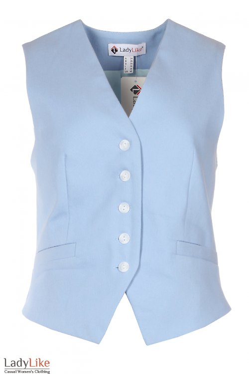 Джинсовий жилет, короткий блакитного кольору. Приталений силует, застібається на п'ять гудзиків, попереду кишені обманки з листочком. Позаду хлястик із двома ґудзиками. Довжина жилету 48 см.