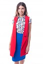 Яскраво-червоний подовжений жіночий жилет. Вільний крій. По боках кишені, відкладний комір. На підкладці. Довжина бл. 92 см.